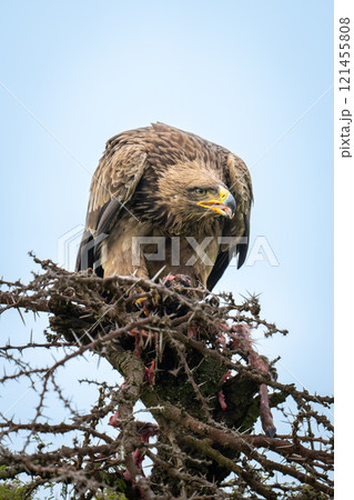 凍てついた朝に木の枝にとまってあたりの様子を伺うオジロワシ