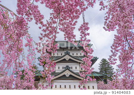 青森県弘前市下白銀町弘前公園 ベニシダレザクラやソメイヨシノに囲まれた青空の弘前城天守閣の景色