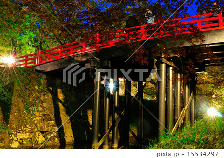 弘前城満月の夜 ライトアップされた花筏の西濠と満開の桜に囲まれる春陽橋 青森県