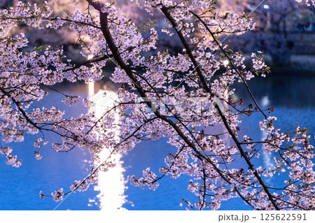 青森県弘前市下白銀町弘前公園 弘前城外堀を囲むソメイヨシノの桜並木ライトアップと水面の水鏡