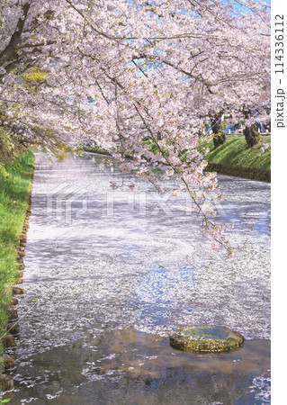 青森県弘前市下白銀町弘前公園 弘前城外濠さくらの花筏とソメイヨシノ