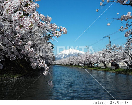 桜満開の弘前城外濠亀甲橋より岩木山を望む 青森県