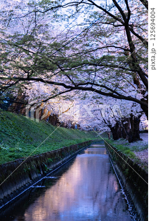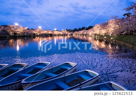 青森県弘前市下白銀町弘前公園 弘前城外濠のさくらの花筏の流れと満開のソメイヨシノ桜並木ライトアップ