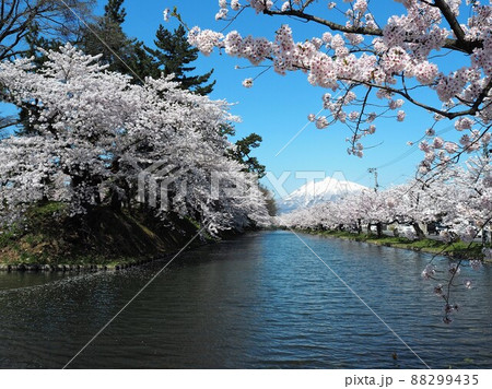 桜満開の弘前城外濠 亀甲橋より岩木山を望む 青森県