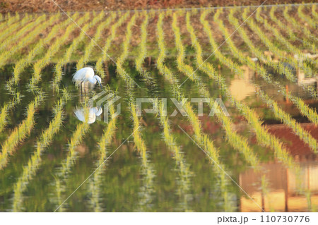 農村の春景色 水田で餌を捕る鷺