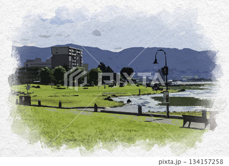 水彩画風 上諏訪 諏訪湖畔公園 長野県諏訪市