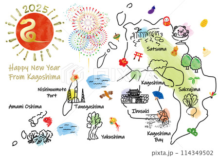 鹿児島県の観光地のイラストマップ年賀状2025年