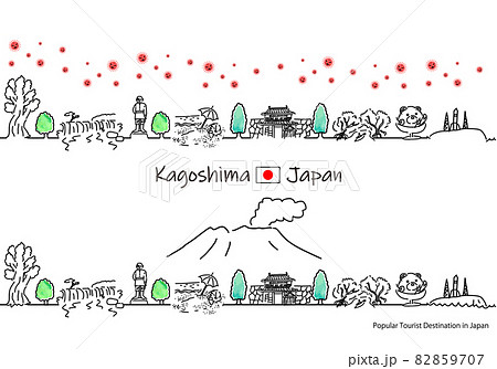 鹿児島県の観光地の街並みと新型コロナウイルスのシンプル線画セット