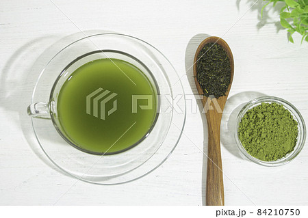 日本で栽培された緑茶を粉末にした粉末緑茶とその原料の茶葉。