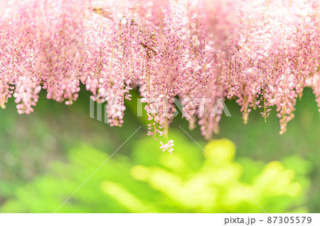 うららかな春の新緑光芒に映える本紅藤の花(クローズアップ) (鹿央古代の森交流施設「里やま」)山鹿市
