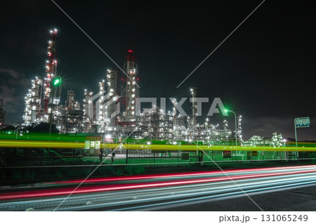 茨城県神栖市にある鹿島石油鹿島製油所の工場夜景と通行車両の光跡