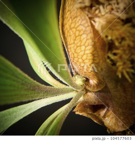 つり下げ観葉植物として人気の着生植物「ビカクシダ(コウモリラン)」の着生様子が写るマクロ接写画像。