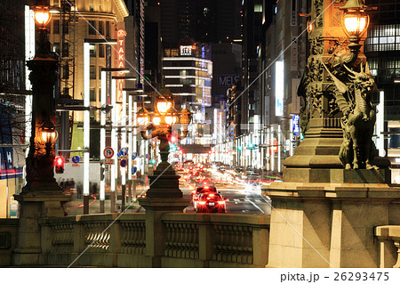 日本橋の麒麟像 夕暮れ時の青空と灯り