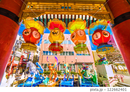 日本の横浜都市景観 朱雀の飾り付け登場。横浜中華街の朱雀門などを望む(春節燈花の提灯が飾られている)