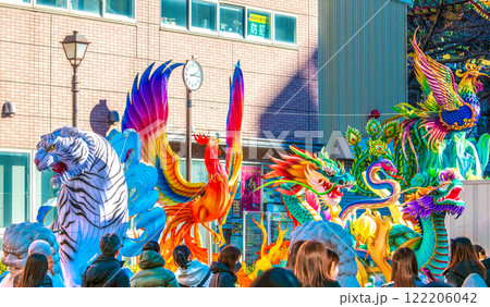 日本の横浜都市景観7年2月。2025春節燈花。山下町公園・「會芳亭」前に聖獣がズラリ…=6日