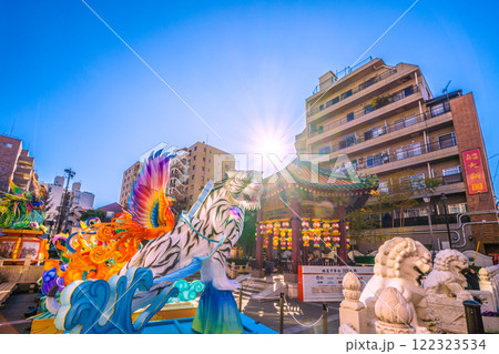 日本の横浜都市景観7年1月。2025春節燈花。山下町公園・「會芳亭」前に聖獣がズラリ…=22日