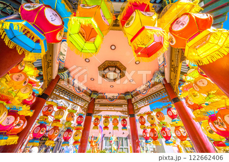 日本の横浜都市景観 2025春節燈花。横浜中華街・関帝廟通り沿いにある憩いの場「會芳亭」=12日