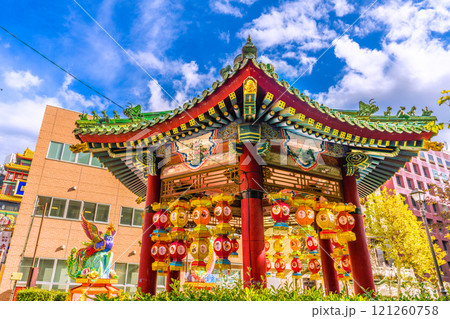 日本の横浜都市景観 青龍の飾り付けが登場。横浜中華街・朝陽門などを望む。新時代へ=2月28日