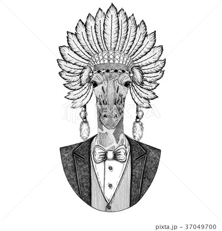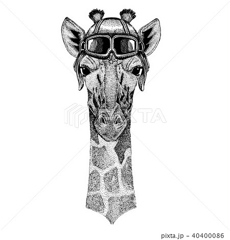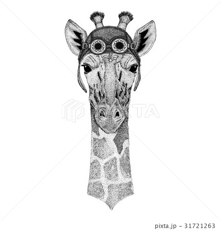 Animal wearing aviator helmet with glasses. Vector picture. Camelopard, giraffe Hand drawn image for