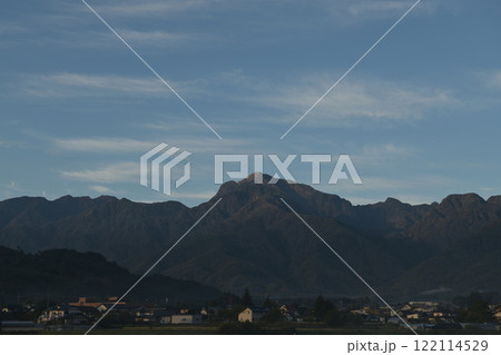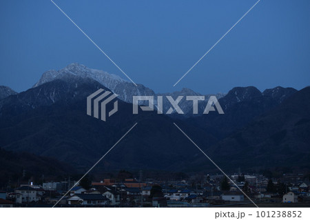 北杜市白州町、ブルーアワーの南アルプス甲斐駒ケ岳と街並み