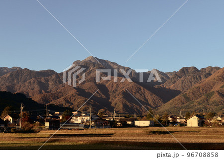 北杜市白州町、朝日が照らす晩秋の甲斐駒ケ岳と麓の街並み