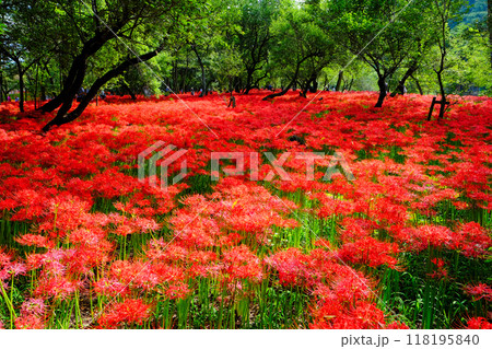 満開の巾着田の曼珠沙華公園の木陰で、木陰の赤い花が咲き誇る