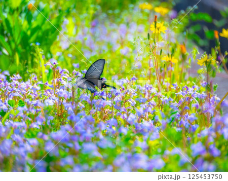 ジャコウアゲハと群生したムラサキサギゴケの花