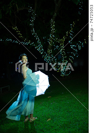 雨模様の夜の公園に立つハーフの女性