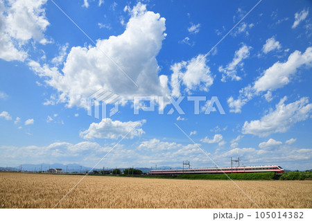 麦秋の麦畑と東武伊勢崎線特急りょうもう号