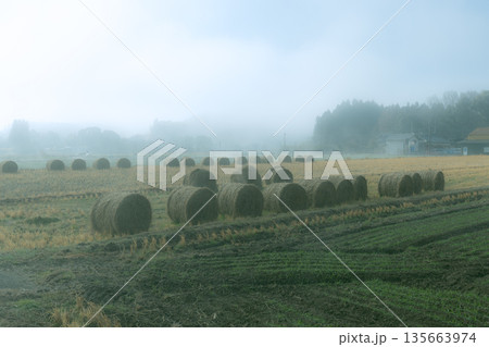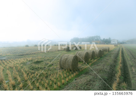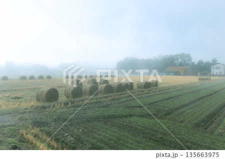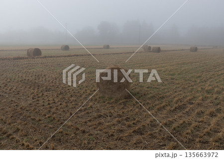 霧の中の麦稈ロール 収穫後の畑に置かれているかわいい麦わらロール