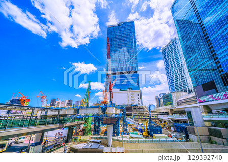 日本の東京都市景観右に向いたクレーン、重機集結。夏のような空が…さよなら渋谷駅西口。右奥に六本木など