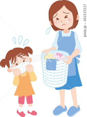 涙目鼻水のママとマスク姿の女の子_上半身