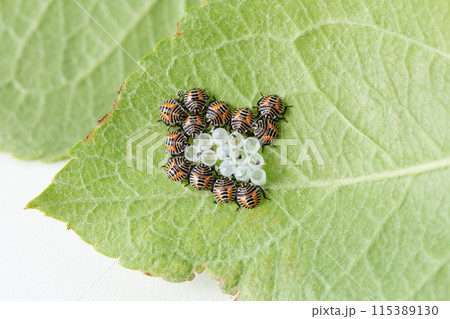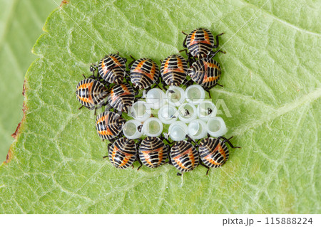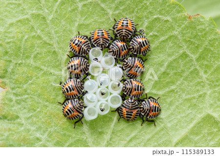 生き物 昆虫 キマダラカメムシ、一齢と二齢の幼虫。孵化後二日程で絶食したまま一齢から二齢に脱皮します