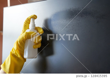 Person cleaning screen with spray bottle and yellow gloves for a streak free