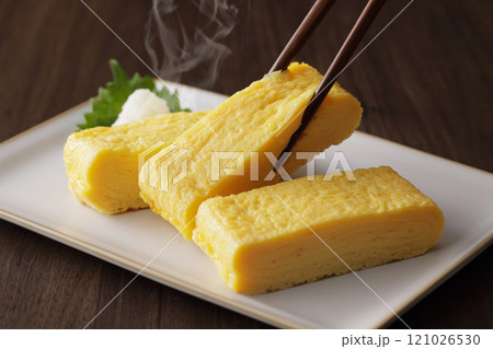おせち料理その3_赤皿の伊達巻_背景赤と金と松