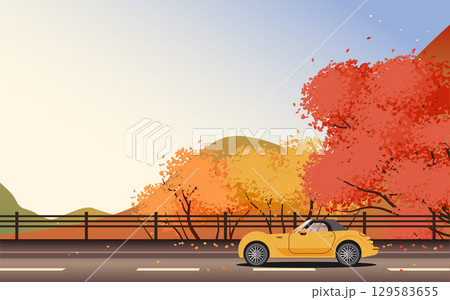 秋の紅葉ドライブする黄色い自動車の背景イラスト素材 ベクター