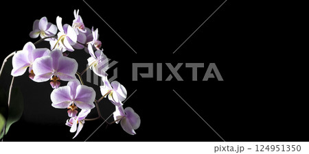 Orchids purple-white buds. Orchid on a dark background. Phalaenopsis bud. A branch of flowers. Delicate flower. Place for text