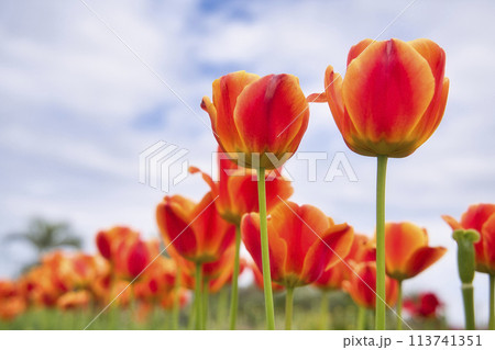 春の花壇に咲く満開の淡いピン黄色のチューリップ