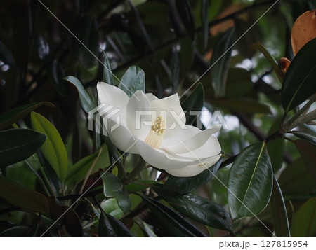 朝開いたタイサンボクの白い花(花芯の見える泰山木)