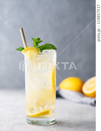 Mojito drink with fresh lemons. Refreshing cocktail with lemon, mint and ice on gray background