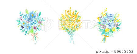 水彩画。水彩タッチの手描きの花束ベクターイラスト。春の花束挿絵。青い薔薇と葉っぱの花束。