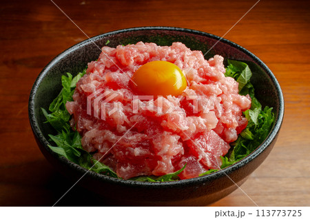 ネギトロ海鮮丼 卵黄乗せ 大葉 俯瞰