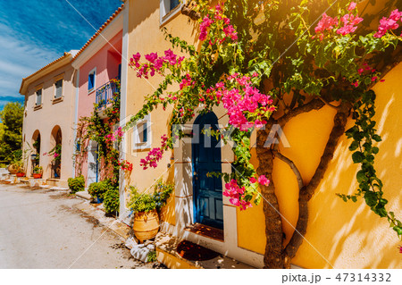 Traditional colorful greek houses in Assos village. Blooming fuchsia plant flowers growing around