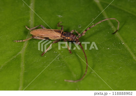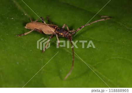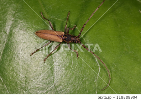 生き物 昆虫 キイロミヤマカミキリ、黒色の前胸に艶消し黄褐色の上翅。太い触角も特徴的