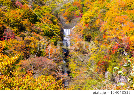 栃木県日光市中宮祠 第一いろは坂の剣が峰展望所から望む方等滝と方等上流砂防堰堤の紅葉の景色