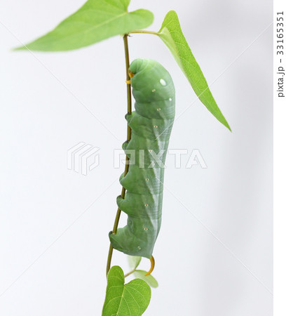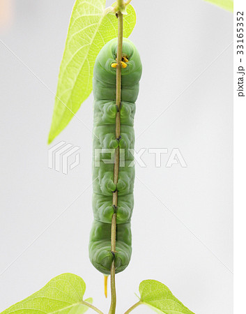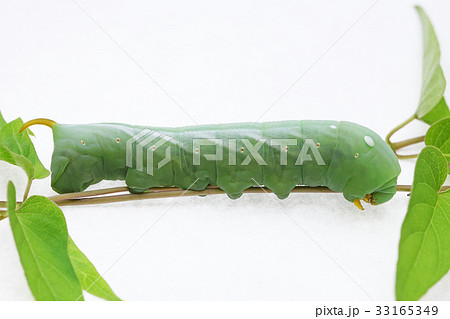 生き物 昆虫 モモスズメ、幼虫。八センチほどの大きなイモムシ。白い点々、とんがり頭に尻尾付きです
