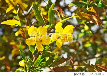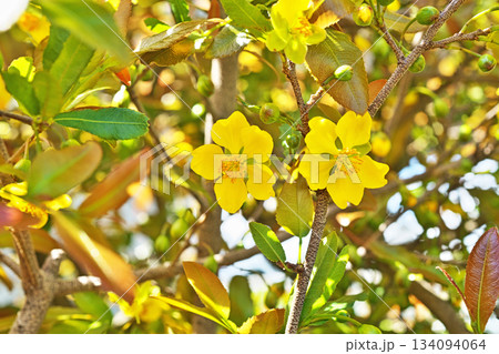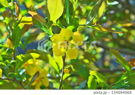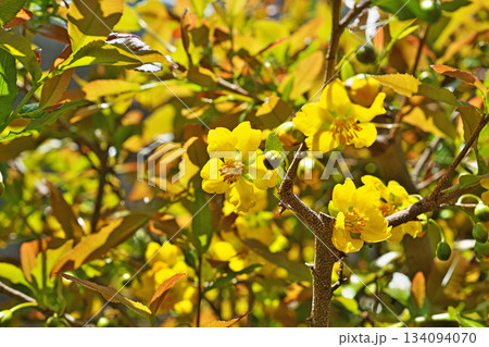 黄色い花、オクナ・セルラタ(ミッキーマウスプランツ・マクロレンズ使用・自然光・接写写真)