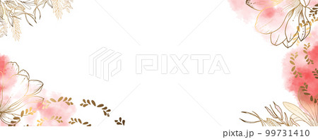 Luxurious golden wallpaper. Banner with pink magnolia flowers and leaves. Watercolor pink, gold stains on a white background. Bright branches. vector file
