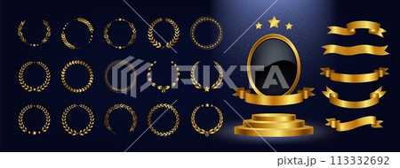 Golden frame and ribbon. Background luxury isolated gold metallic elements. Ceremony premium, certificate stage, elegant winner design, circle template grand, award ceremony decor. Vector premium set