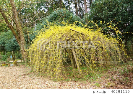 早春の木の花・鮮やかな黄色の花を付けて花枝を伸ばすレンギョウ・横位置